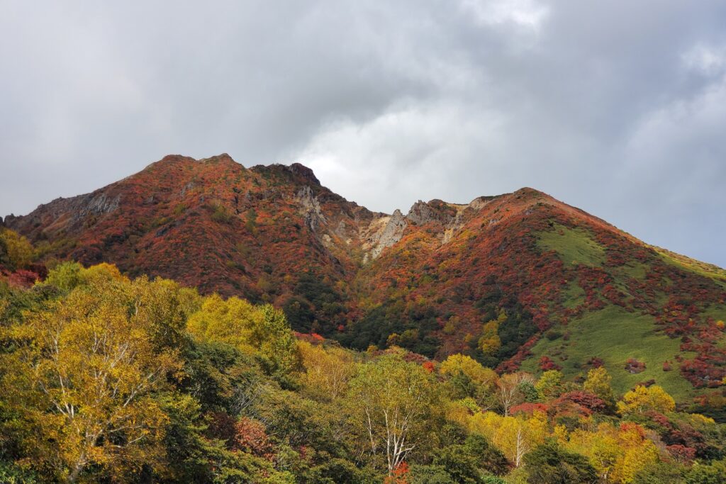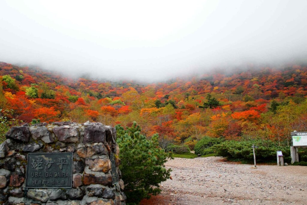 那須の紅葉は主峰、茶臼岳の裏側にある姥ヶ平周辺から始まり、少しずつ山を下りてきます。