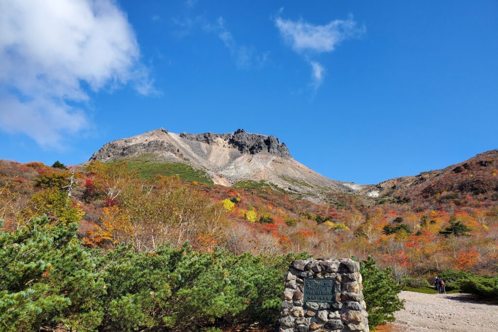 ここにある休憩場所で茶臼岳の山頂と紅葉を眺めながらの休憩はお勧めです。
