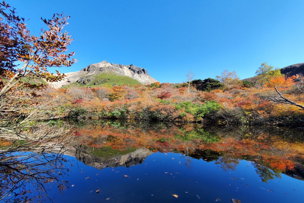 ひょうたん池への茶臼岳と紅葉の映り込みを見ることができました。